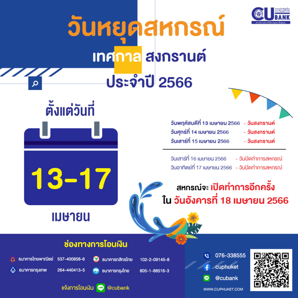 ประกาศ! วันหยุด สหกรณ์เครดิตยูเนี่ยนเคหะรัษฎาภูเก็ต จำกัด “เทศกาลสงกรานต์ ประจำปี 2566”