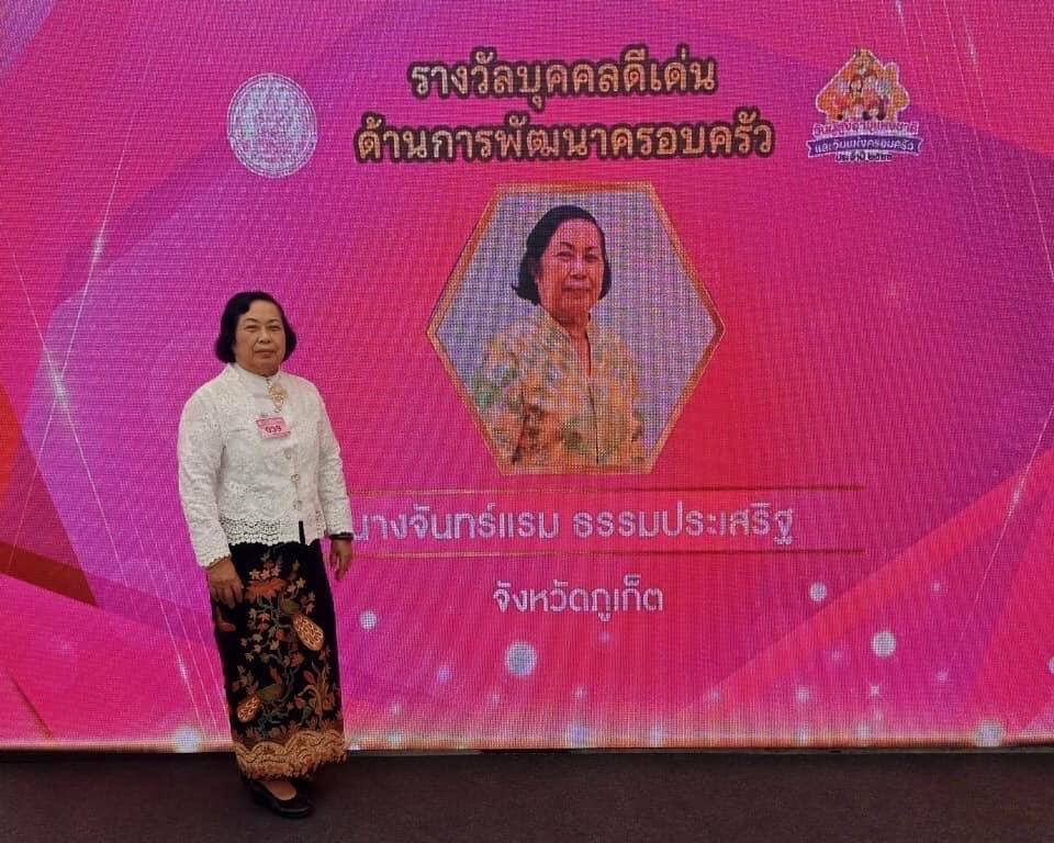 วันที่ 5 เมษายน 2566 ณ ลานอเนกประสงค์ ชั้น 2 อาคารรัฐประศาสนภักดี (อาคาร ศูนย์ราชการเฉลิมพระเกียรติ 80 พรรษา 5 ธันวาคม 2550 กรุงเทพมหานคร นางจันทร์แรม ธรรมประเสริฐ ประธานศูนย์พัฒนาครอบครัวในชุมชนตำบลรัษฎา เข้ารับโล่ประกาศเกียรติคุณ : บุคคลดีเด่นด้านการพัฒนาครอบครัว จังหวัดภูเก็ต ประจำปี 2566 โดยได้รับเกียรติจากนายอนุกูล ปีดแก้ว ปลัดกระทรวงการพัฒนาสังคมและความมั่นคงของมนุษย์ เป็นประธานในพิธี ในงานวันผู้สูงอายุและวันแห่งครอบครัว ประจำปี 2566