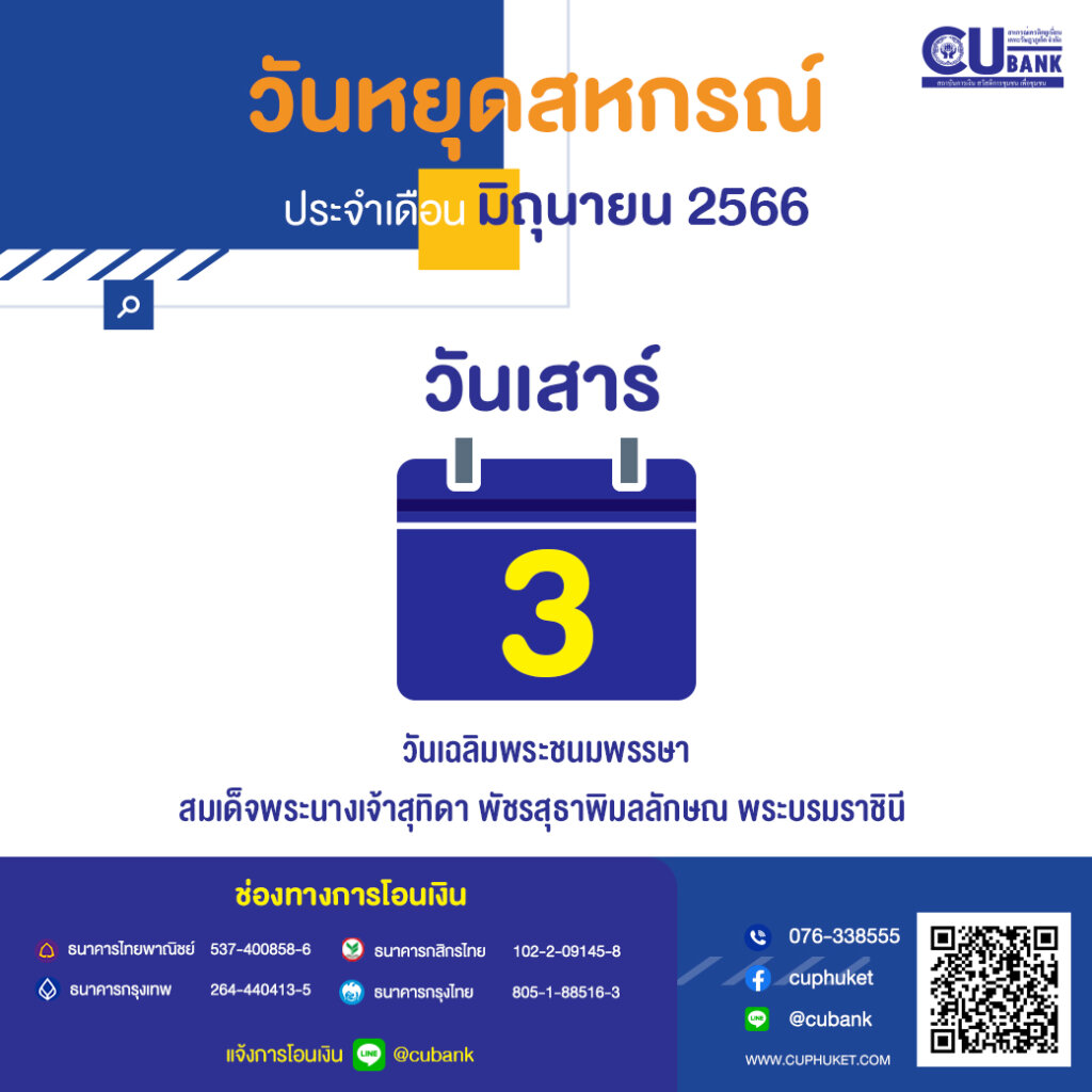 ประกาศ! วันหยุด สหกรณ์เครดิตยูเนี่ยนเคหะรัษฎาภูเก็ต จำกัด “ประจำเดือน มิถุนายน 2566” ดังนี้