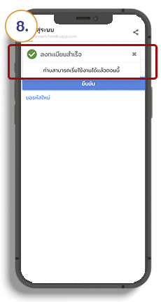 หากข้อมูลถูกต้อง หน้าจอจะแสดง “ลงทะเบียนสำเร็จ” และสามารถเริ่มใช้งานได้ทันที